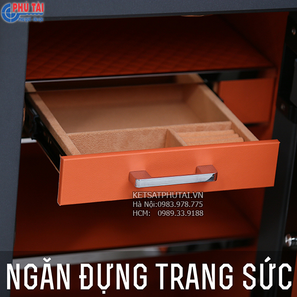 + Nội thất : Bên trong két có 01 ngăn kéo cao cấp để trang sức, 01 đợt chia; lòng két để được file giấy A4 , túi Clear Bag