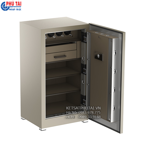 Ngăn ẩn được bố trí kín đáo ở đáy két, tích hợp cơ chế mở ngầm thông minh kết hợp hệ thống nâng thủy lực tự động, giúp tấm ngăn mở ra nhẹ nhàng, êm ái, tạo nên một không gian lưu trữ riêng tư tuyệt đối cho tài sản, giấy tờ hoặc vật phẩm có giá trị cao.