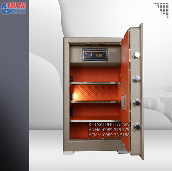- Không gian: Bên trong két có 01 ngăn phụ có mật mã + 02 đợt di động; lòng két để được file giấy A4 , túi Clear Bag