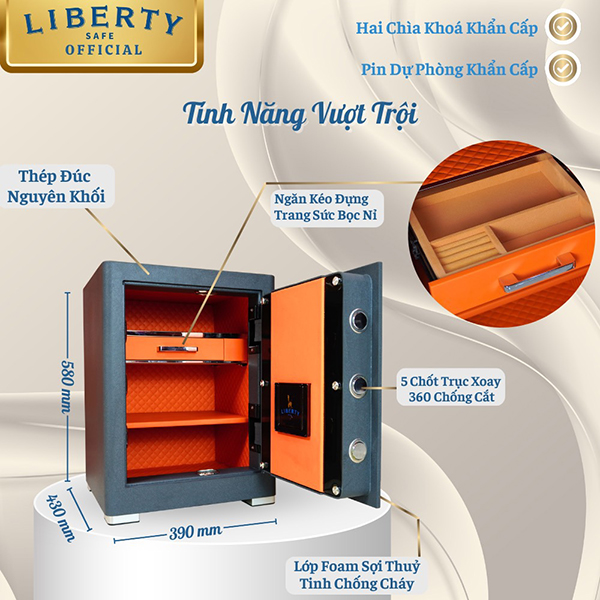 Thiết kế khá sang trọng, Nội thất bọc da cao cấp: Ngay từ lần đầu mở két chắc chắn bạn sẽ bất ngờ với nội thất bọc da với độ hoàn thiện tay nghề rất cao và tỉ mỉ của Liberty không thua kém hàng cao cấp nhập khẩu