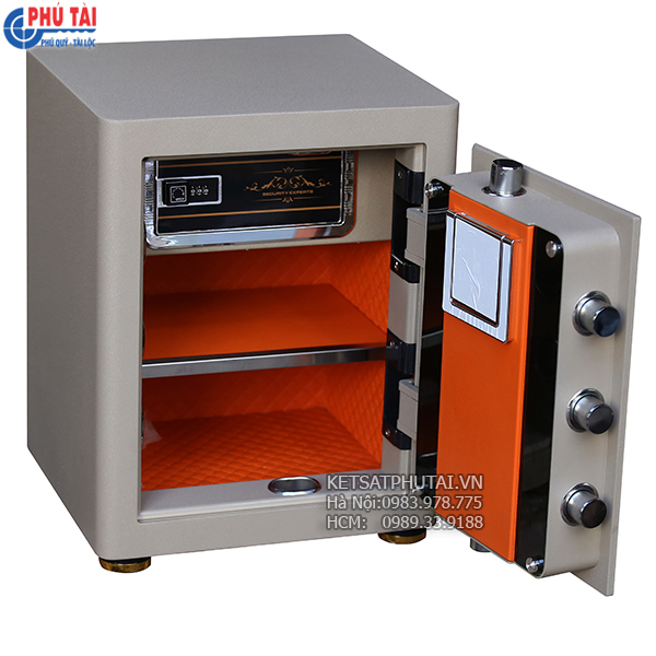 - Không gian: Bên trong két có 01 ngăn phụ có mật mã + 01 đợt di động; lòng két để được file giấy A4 , túi Clear Bag