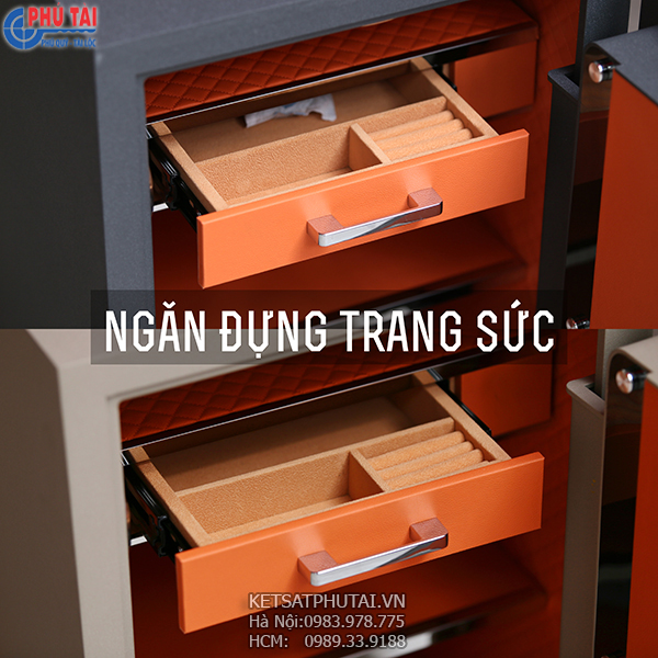 - Không gian: Bên trong két có 01 ngăn đựng trang sức + 01 đợt di động; lòng két để được file giấy A4 , túi Clear Bag thoải mái.