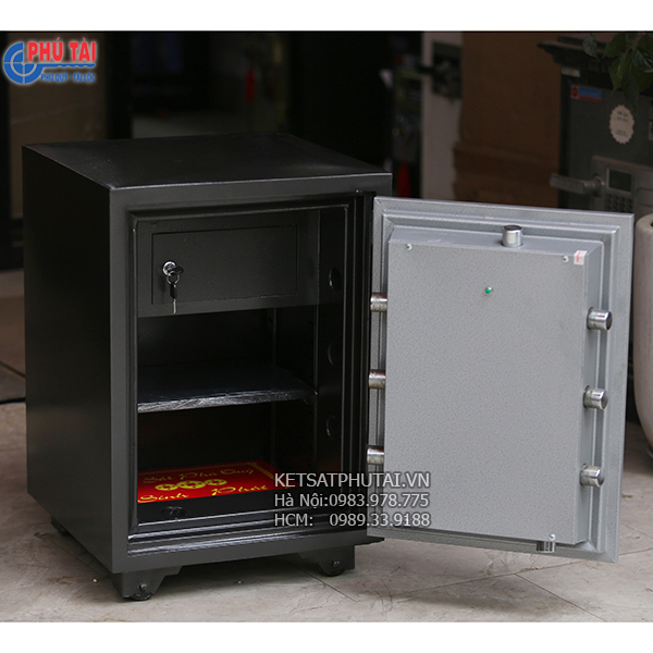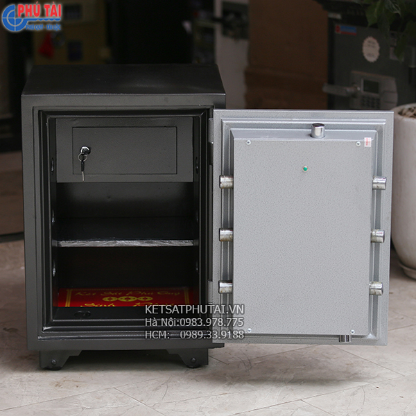 Bên trong két có 01 ngăn phụ có khóa + 01 đợt di động. Cánh cửa bản lề ngoài - mở rộng 180độ. Sơn 3 lớp độ bền cao.
