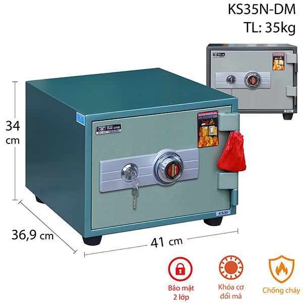 Két sắt Hòa Phát The One KS35N (KS35N-K1C1) khóa cơ là mẫu két sắt được làm bằng thép không gỉ và có chất chống cháy giúp bảo vệ đồ đạc trước các đám cháy. Két được cải tiến với bản lề nổi giúp tăng góc mở két lên 180 độ cực kỳ linh hoạt.